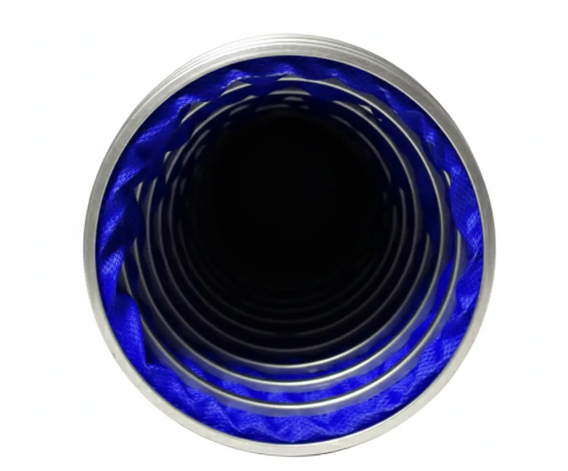 Duas camadas de PVC com trama de poliéster, reforçada com espiral externa de aço carbono;